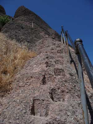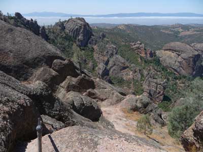 After climbing the steep trail all morning, we missed the fork that would have taken us to the completely tame (or so I was promised) tunnel trail. Now we were high on the mountain side at Pinnacles National Monument, looking out over the state of California all the way to the foggy coast, and the trail only led higher.