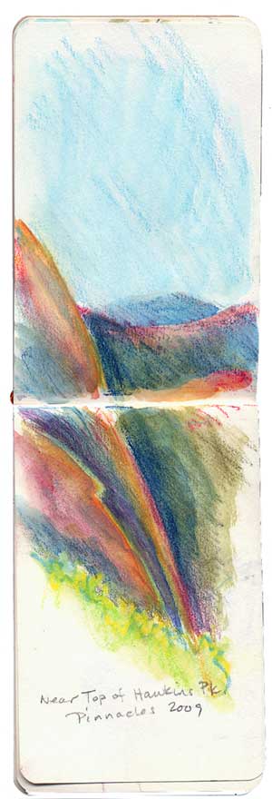I’d like to say that I felt victorious and renewed afterwards. I guess I did, a little. But mostly I was tired and hungry. And needing to paint something. Out came my little hiking journal, a waterbrush, and a afew Caran d’Ache watercolor sticks. I rested in the shade, ate a tortilla with hummus, and did what any artist at any age might do. I painted a picture of the mountains.