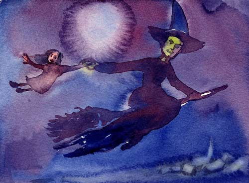 So this week I’m promising to post every day, sending paintings of seasonal spookiness out into the blogosphere for your enjoyment. I’m the witch on the souped up broomstick, laughing like a hyena, carrying you away into the night.