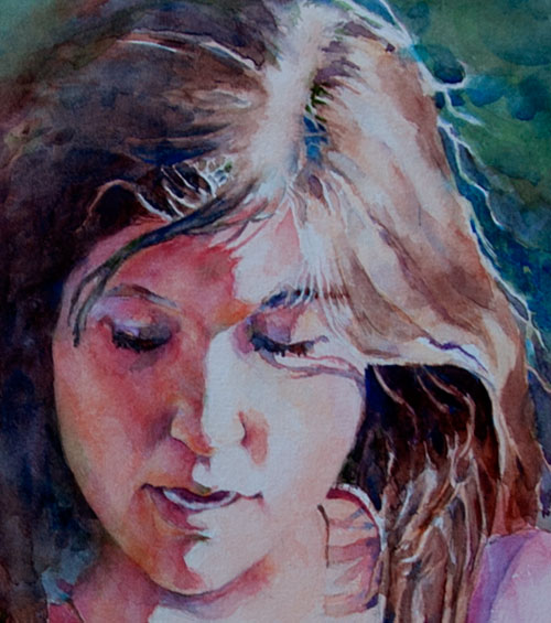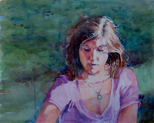 When I painted this picture, I remembered that Mary Whyte, in a workshop, told us to name our paintings before we made our first washes of color. I couldn’t for the life of me remember this girl’s name (the daughter of a cousin-in-law, she’s a delightful girl, but I only met her once), so I just called her princess. I don’t mean princess in a bad way—all diva and finer-than-thou—but princess in a good way, a fairytale Cinderella-sorting-ashes or brave-and-loading-bullets sort of way.