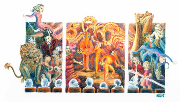 My niece asked me to post this drawing I made for her and her sister several years ago. It came from a dream I had in which my nieces and I were called up onto the stage of a circus. (Had we seen Cirque du Soleil yet? I’m not sure.)
