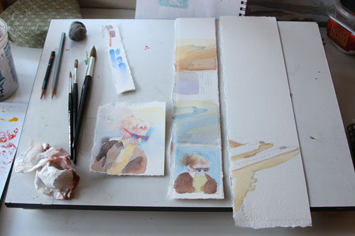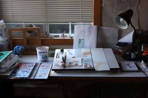 A new painting is taking shape, which means I’m making lots of color sketches at my little art desk. This is a shot of the mess and the makings.