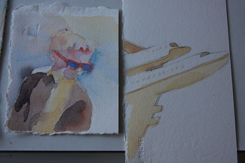 These are a few of the studies I’ve made for this painting. The earlier ones don’t really look like anything, just blobs of color. You can see that the Space Shuttle Endeavor is going to be part of this painting.