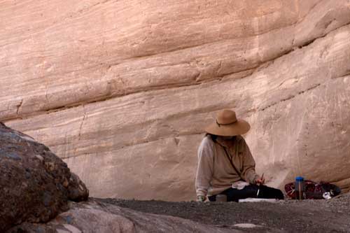 When painting in public, I often feel like I become part of the scenery. On their way to the Devil’s Golf Course, tourists stopped and from the comfort of their car watched me paint. Some stopped twice: once on their way in and once again as they drove out, checking my progress. One man, a tourist from New York City, asked, “Can I take your photo? It’s a great shot, with you painting and the whole valley around you.”