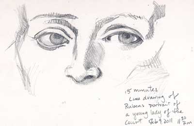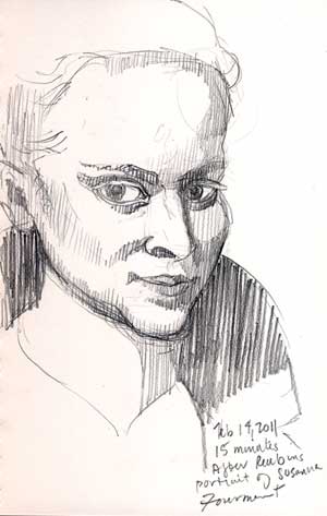 I’ve never seen so many harps in one place! Pixie harps, celtic harps, concert harps, wire strung harps. The music was lovely, the church was beautiful, with lots of milky winter ocean light pouring through etched-glass windows. Perfect for drawing, but the sanctuary was crowded, and I was, of course, struck with extreme shyness. Someone might look at me! Oh! The Horror! But I dredged up some grit, got out my journal and sketched while the musicians played. If anyone watched me, I didn’t know about it. I listened to the music and drew. It was like a little bit of heaven.