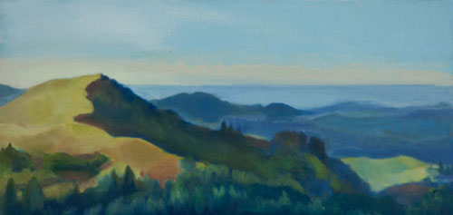 For the last 3 Saturdays I’ve been at Russian Ridge, painting Mindego Hill. It’s an iconic view from the ridge: Mindego Hill rises over the coast range of mountain ridges rippling all the way to the sea. On a clear evening from the ridge, you can watch the sun set into the Pacific.