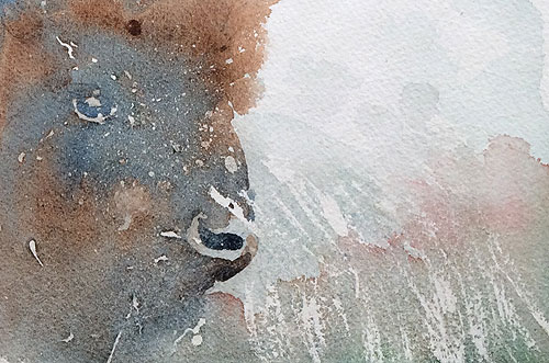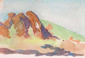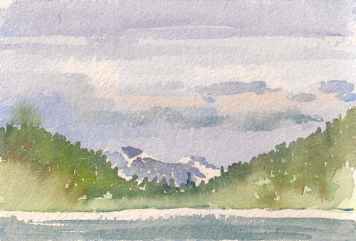 I’ve been trying to loosen up my watercolor landscapes; normally I make a tight pencil drawing on the paper before I start applying water and pigment. But I’m not liking the results. The image is too tight, much like a cartoon.