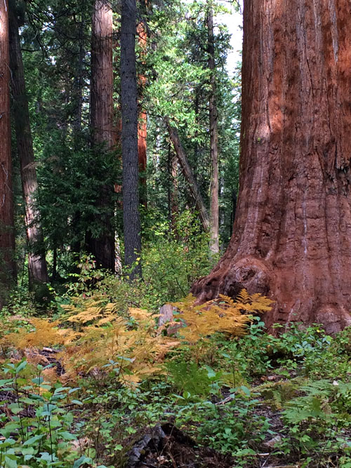 Our new home is an easy drive to a grove of giant Sequoias. I had never before seen these particular big trees. Although they are related to coast redwoods, they are as different as second cousins twice removed. Where the coast redwoods seem to doze in the soft green light and drippy air of their coastal home, the giant Sequoias seem alive and awake, the colors of tree, leaf and sky sharp and at attention in the bright clear air of the mountains.